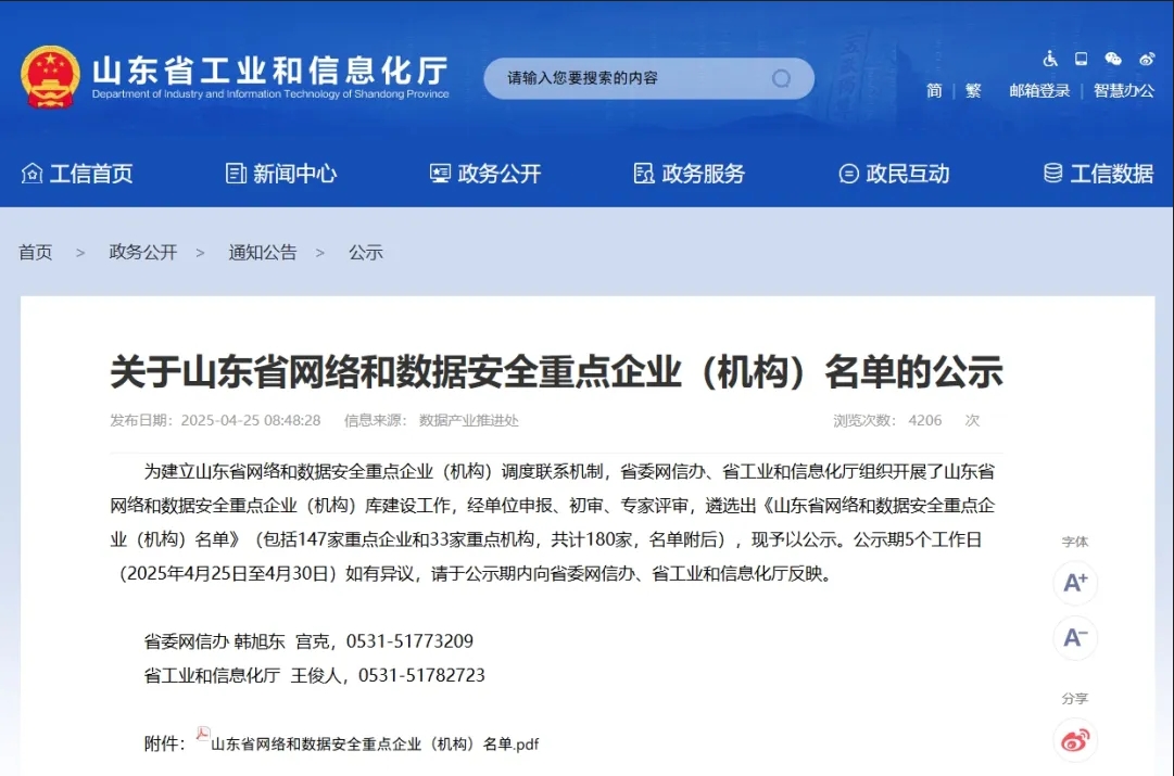 近日,在省委網(wǎng)信辦、省工業(yè)和信息化廳聯(lián)合開展的山東省網(wǎng)絡(luò)和數(shù)據(jù)安全重點企業(yè)(機構(gòu))庫建設(shè)工